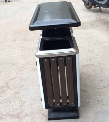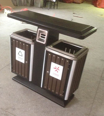產品材質:欣方圳物業雙分類鋼木垃圾桶采用現代化批量制作工藝