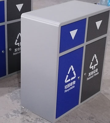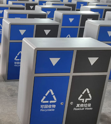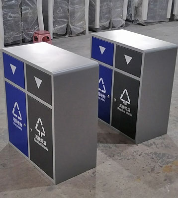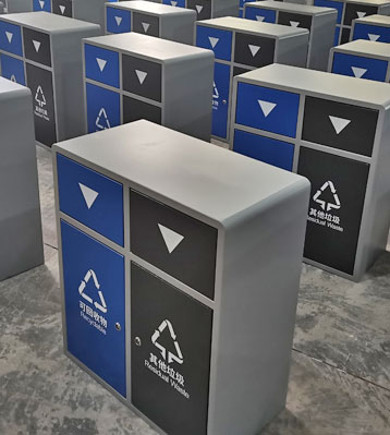 產(chǎn)品材質(zhì):戶外分類垃圾箱采用現(xiàn)代化批量制作工藝,選用優(yōu)質(zhì)冷軋鋼板,核心部件模壓成型不脫焊不易破損堅固耐用。推蓋投口在重力作用下自動復位,達到密閉無異味散發(fā)的效果。可回收物、其他垃圾2分類設(shè)計,對應(yīng)藍色、深灰色門板絲印新版垃圾分類標識,方形外觀整體扎實耐用。表面經(jīng)過除油、噴砂防銹處理后,再進行酸洗磷化處理,鋼制桶表面清理后整體進行靜電噴涂或烤漆處理,靜電噴涂是經(jīng)過流水線高溫固化爐固化后再出爐冷卻,漆面色澤耐久,防腐防銹。