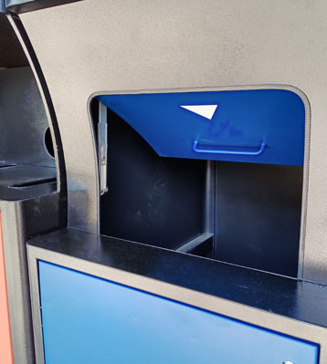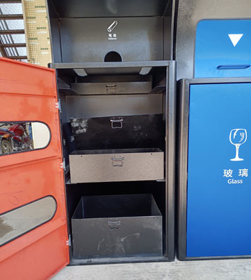 深圳垃圾桶分類標準桶由有害垃圾、玻璃、金塑紙(為金屬、塑料、紙張的簡稱)、廚余垃圾、其他垃圾收集容器組合而成。采用優質鍍鋅板或不銹鋼材質制作,底板材料厚度2.0mm,外罩材料厚度1.5mm,有害垃圾收集容器的內部構件材料厚度1.2mm。有害垃圾收集容器配置外罩,不配置內桶.內部設置電池、長燈管、短燈管、家用化學品抽屜,抽屜鍍鋅材質噴塑安裝拉手。長燈管抽屜斜面角度為56°,投放口設置防護膠條,絲印白色分類標識。其余收集容器由外罩和120/240/660L內桶組成。配件:鉸鏈鋅合金材質,撐桿、拉手、螺絲釘、門鎖、鑰匙、廚余垃圾箱插銷等不銹鋼材質。