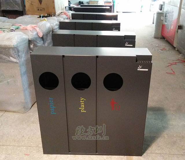 ??欣方圳此款F220酒店鋼制分類垃圾桶,其產品規格為:940*260*985mm。桶身由兩層構成,外層采用優質冷軋鋼材料,內層為鍍鋅內桶。外層的logo采用凹式激光切割鏤空,采用激光切割凹式雕刻,并別出心裁地嵌入“禁止吸煙”標識,使標識與頂板完美融為一體。與其它垃圾桶設計的不同之處,欣方圳商務垃圾桶在于把底座做的特別寬,鋼制板材桶身夠重,桶身貼地平穩,不會像廉價產品一樣左搖右晃。