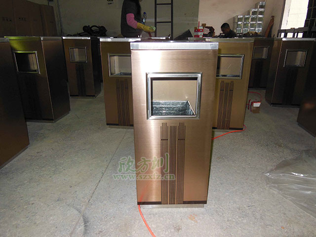 ??欣方圳的C52不銹鋼垃圾桶采用不銹鋼經(jīng)鍍鈦處理,專(zhuān)業(yè)除銹,表面采用專(zhuān)用戶(hù)外高溫烤漆,保證色彩鮮艷持久,最大程度的延長(zhǎng)了產(chǎn)品生銹時(shí)間。桶身外飾大理石,鍍鋅板內(nèi)膽,直接擺放在地面,非常方便。產(chǎn)品表面呈金黃色,光滑亮麗,彰顯高貴本色,因此,鈦金垃圾桶是不少星級(jí)酒店、賓館、娛樂(lè)城、銀行、商務(wù)寫(xiě)字樓等單位的首選。?